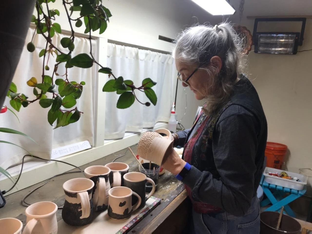 Pre-firing, Dawn adds finishing touches to her pottery at Coddiwomple Studio